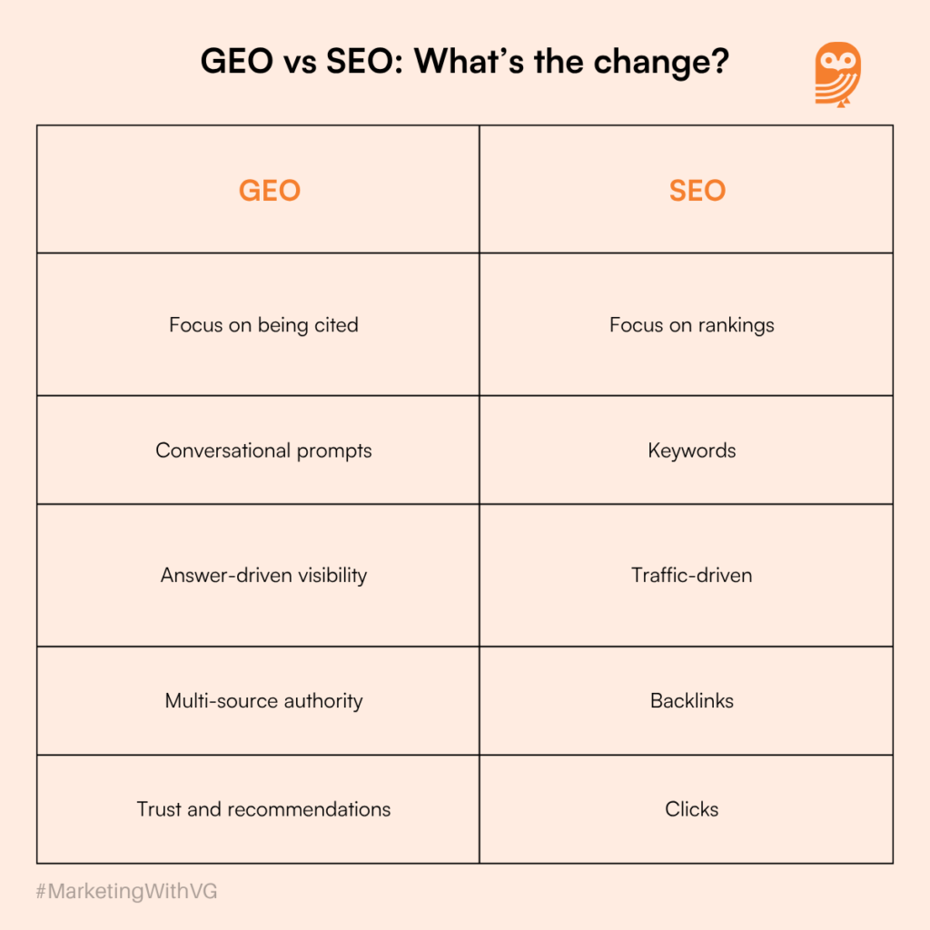 Unlike traditional SEO, where success is measured by rankings and clicks, GEO shifts the focus to inclusion and influence within AI-generated responses.